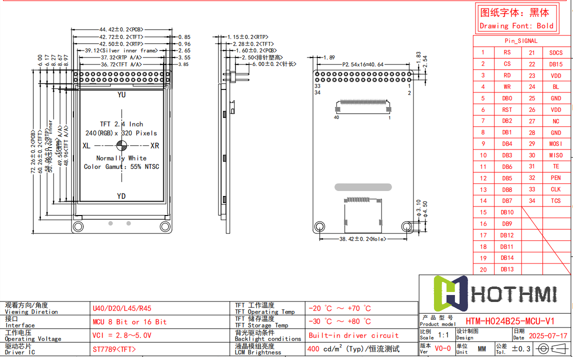 | 2.4寸TFT模块|240X320分辨率|MCU SPI-4L接口|内置ST7789V IC|HTM-TFT024A16-SPI | SPI-TFT | 240x320 |